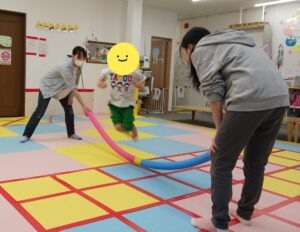 集団活動では縄の替わりにプールスティックを2本つなげて跳んでみました!!