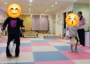 昨日の集団活動ではぬいぐるみを脚で挟んで、落とさずにジャンプで進む活動をしました!!