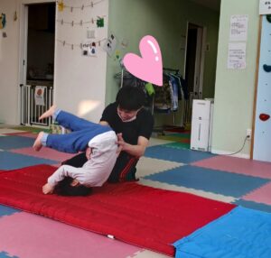 集団活動後の自由遊び時間は、マットにくるまりながら職員とやりとりしながら